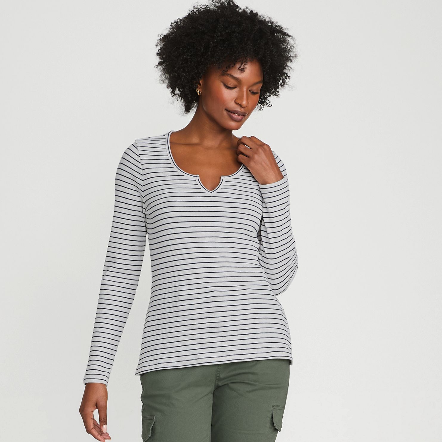 Nothing beats the versatility of a long sleeves tee, especially when it is made in a super-soft, small waffle knit fabric. But to make it a bit more special, we added a notch detail to the scoop neckline which will add a touch of interest to your look.