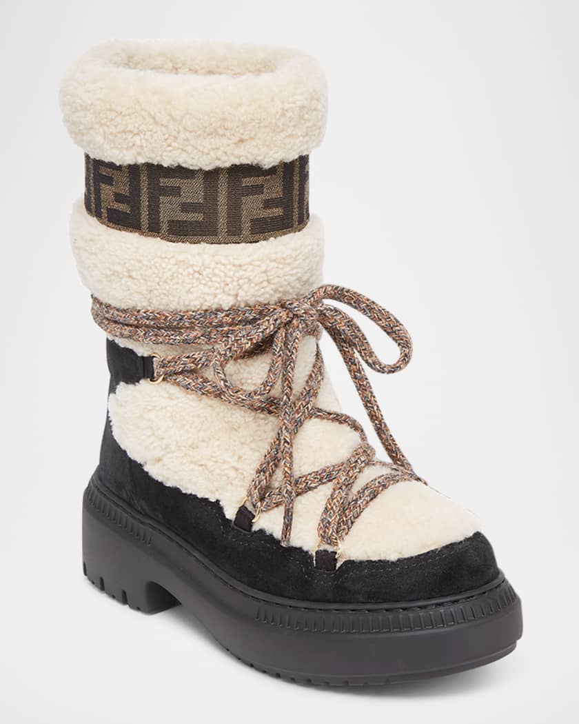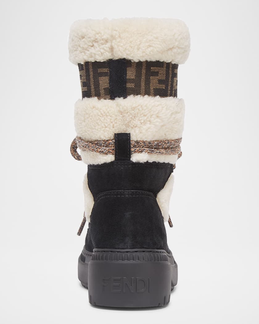 Fendi "Apres Chic" ski boots in suede with bleached sheep shearling (Italy) and FF monogram trim 1.00 in / 25 mm chunky heel Round toe Lace-up vamp Rubber outsole with embossed logo at back Professional cleaning recommended, spot clean Made in Italy