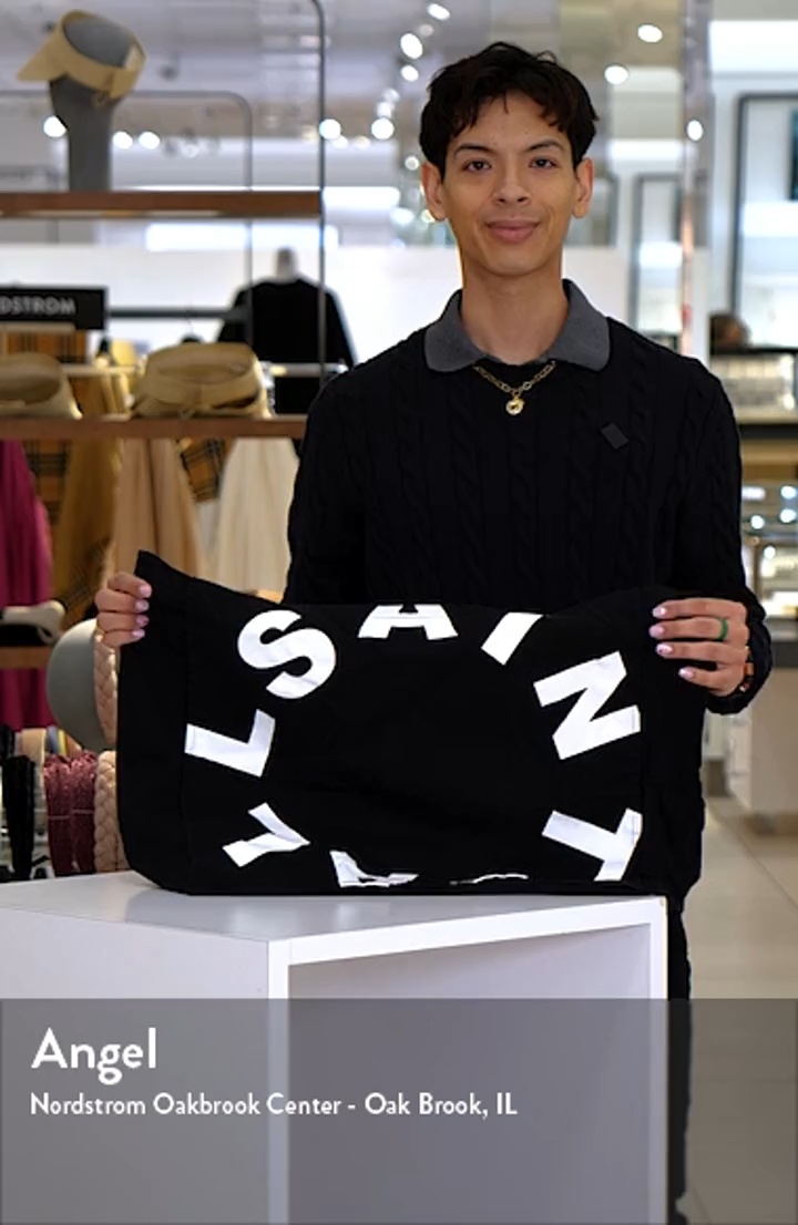 <p>Bold logo lettering dials up the street-chic style of a spacious tote made from lightweight yet sturdy cotton canvas.</p>