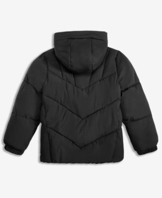 With a charming mermaid quilt design and faux down fill, this Sam Edelman solid puffer jacket wraps her in warmth for every outdoor adventure. An attached hood provides added protection, while fleece-lined pockets offer cozy comfort for little hands.