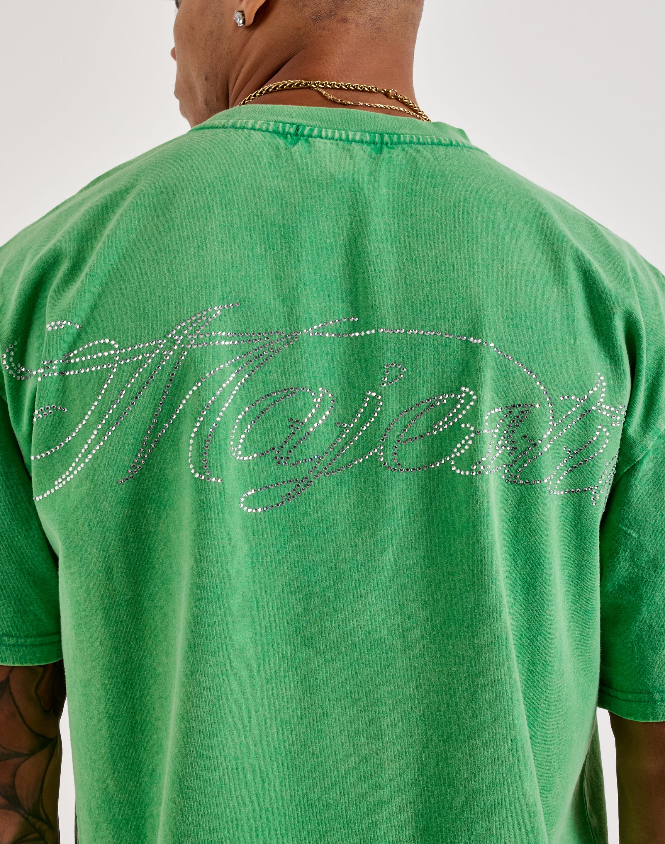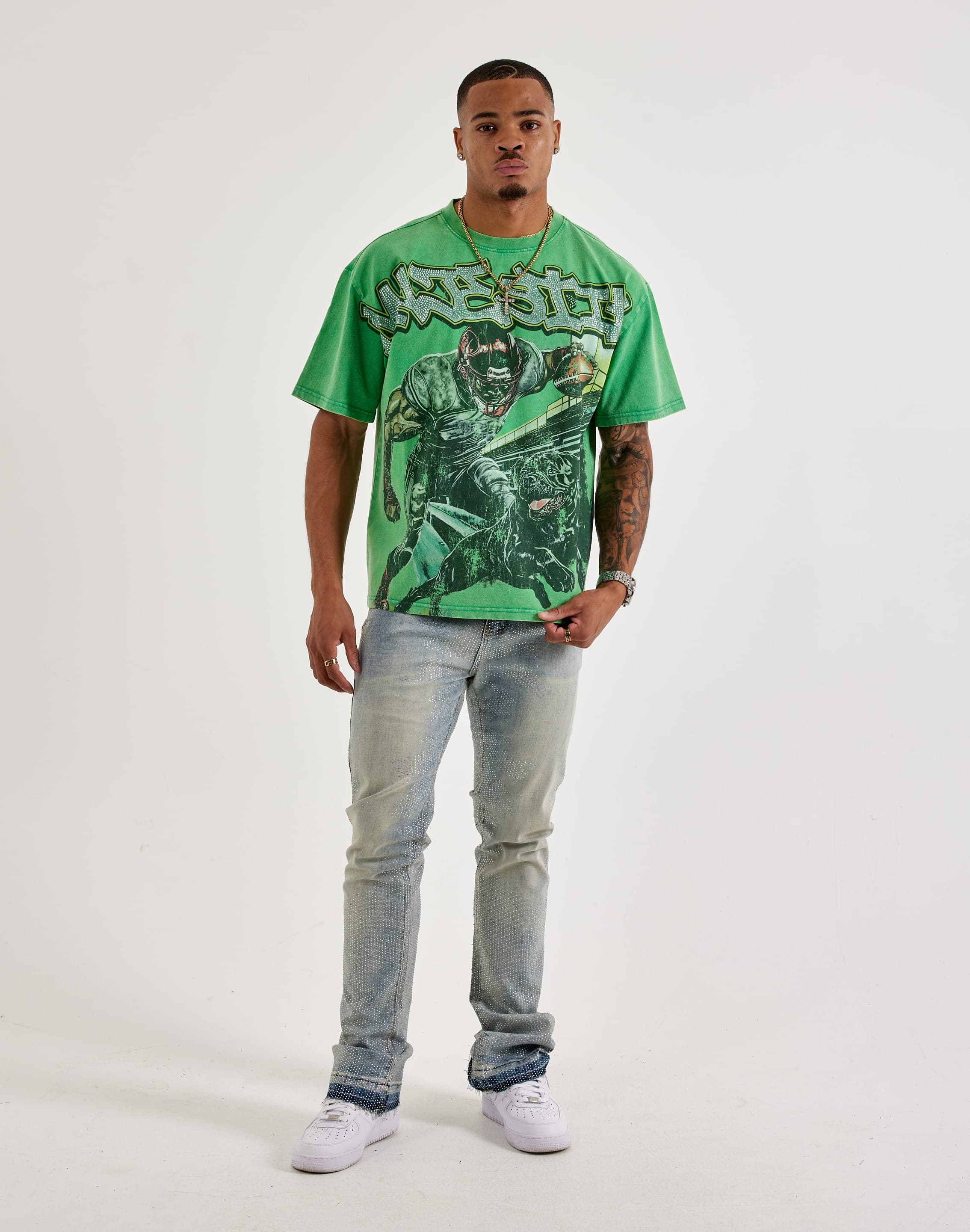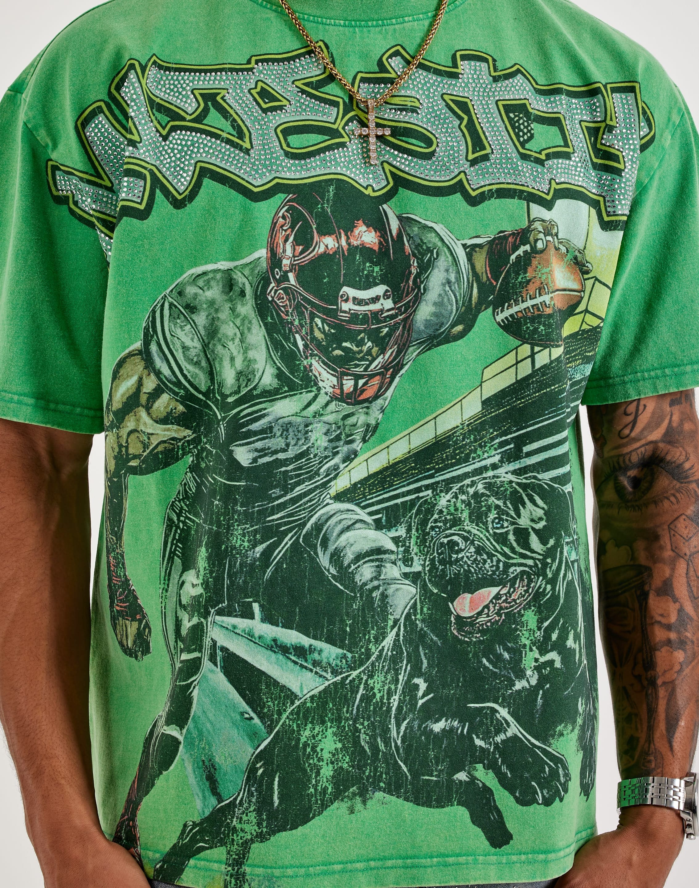 The Majestik Football Dog Tee showcases bold graphics on soft, garment-dyed fabric for all-day comfort. Perfect for everyday wear, this tee gives you standout style. Printed graphics Rhinestone studs Short sleeves Ribbed crewneck collar Cotton material Model is 5'9 wearing size L