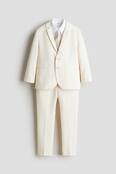 Set with a lined suit jacket and pants in soft woven fabric, a shirt in poplin, and a matching pre-tied tie. Jacket with notched lapels, buttons at front, welt front pockets, and a vent at back. Pants with an adjustable, elasticized waistband, zip fly with button, a decorative back pocket, and pleats. Shirt with a turn-down collar, buttons at front, a yoke at back, and long sleeves with button at cuffs. Pre-tied tie with an adjustable, elasticized strap and a plastic fastener at back.
