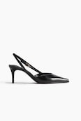 Pumps in coated fabric. Pointed toes, narrow, adjustable heel strap with metal buckle, and narrow, covered heels. Heel height 2 3/4 in.