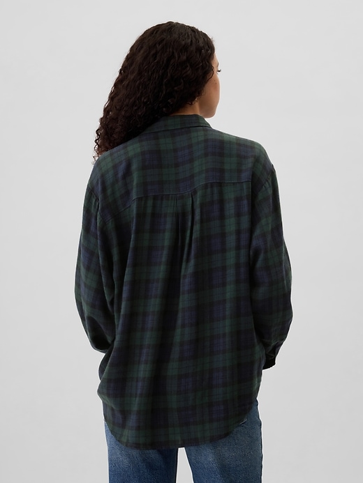 Smooth flannel weave. Dropped shoulder, long sleeves with button cuffs. Spread collar, button front. Patch pockets at chest. Curved shirttail hem. Assorted allover plaid. #516600