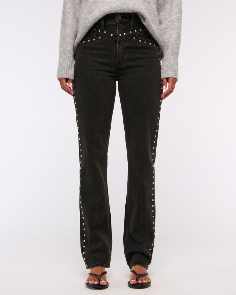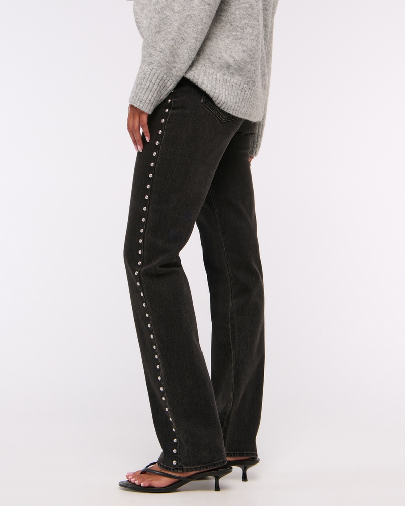 Our classic 90s straight jeans in a black wash, with studded details and a clean hem. This fit features an 11.5” ultra high rise, is fitted at top of body and eases through the thigh into a straight leg shape with a full length inseam. This jean is made from our vintage stretch fabric which features both an authentic vintage look and contains slight built-in stretch for additional comfort.