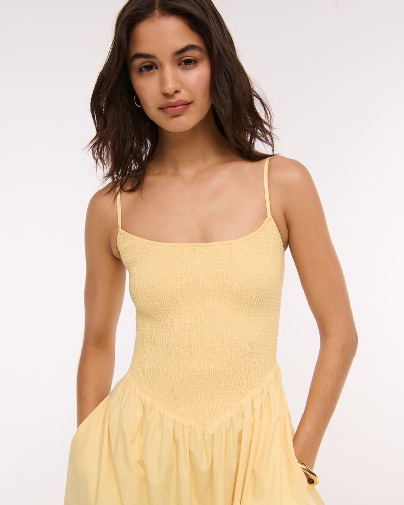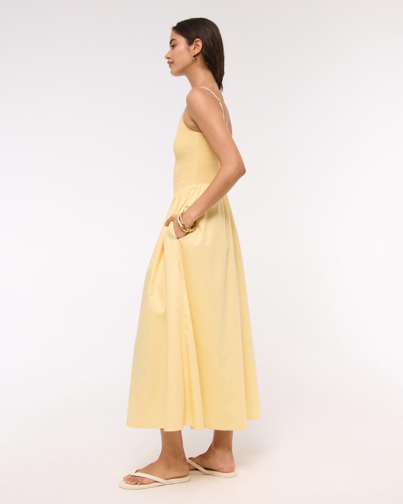 Flattering midi dress in our soft poplin fabric, featuring smocking details along the bodice, adjustable straps, scoop neckline and a flowy skirt.