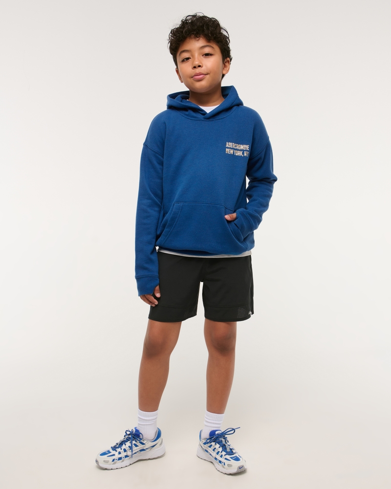 Comfy popover hoodie in a soft fleece fabric and relaxed-fit silhouette, featuring print logo details at left chest and back, front pouch pocket, ribbed hem and thumbholes at cuffs.