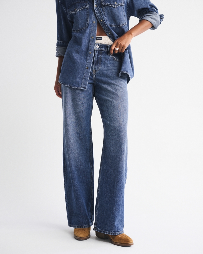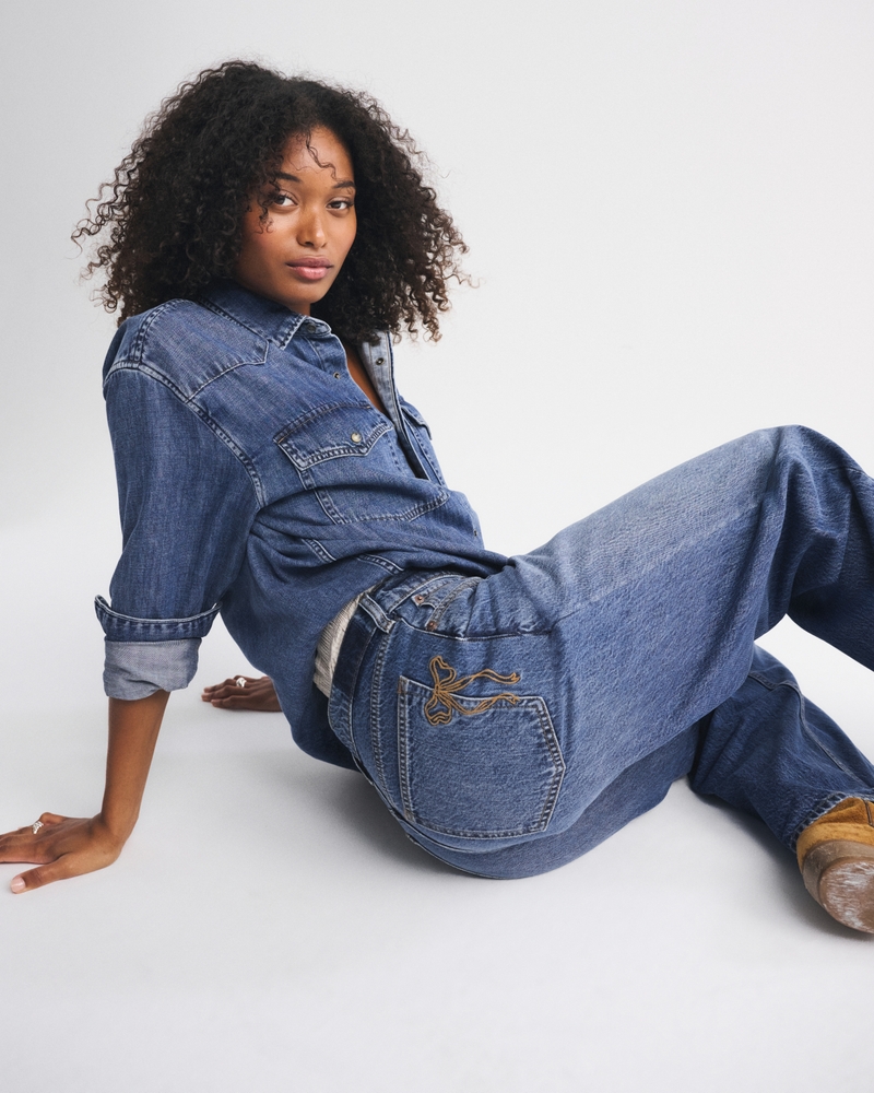 Our Curve Love ultra loose jeans in a medium wash, with embroidered bow detail and a clean hem. This fit features a low rise, is relaxed at the waist and hips and eases at the thigh into an ultra loose leg shape with a full-length inseam. We recommend buying your true size for a baggier fit. Size down for a closer fit. The viral fit that eliminates waist gap: Curve Love features additional room through the hip and thigh for curve-hugging comfort. This jean is made from our drapey rigid denim, a super soft authentic cotton fabric with no stretch.