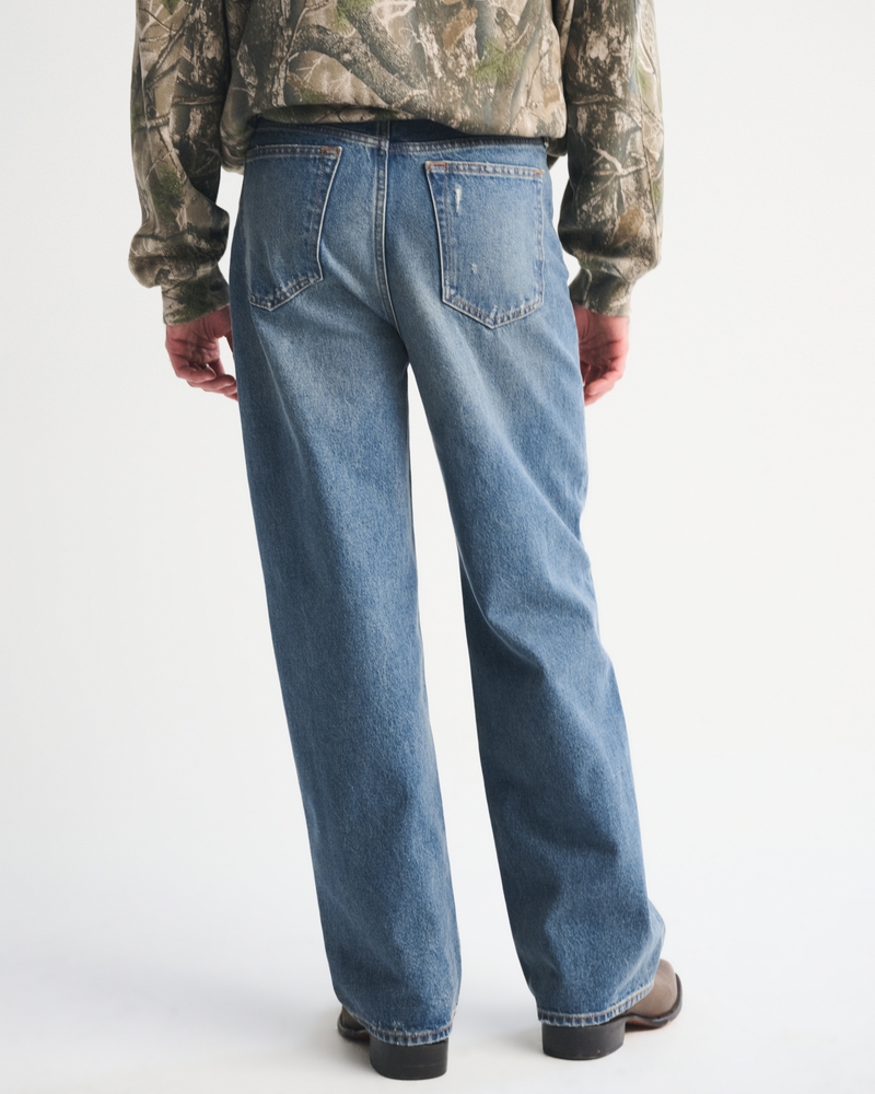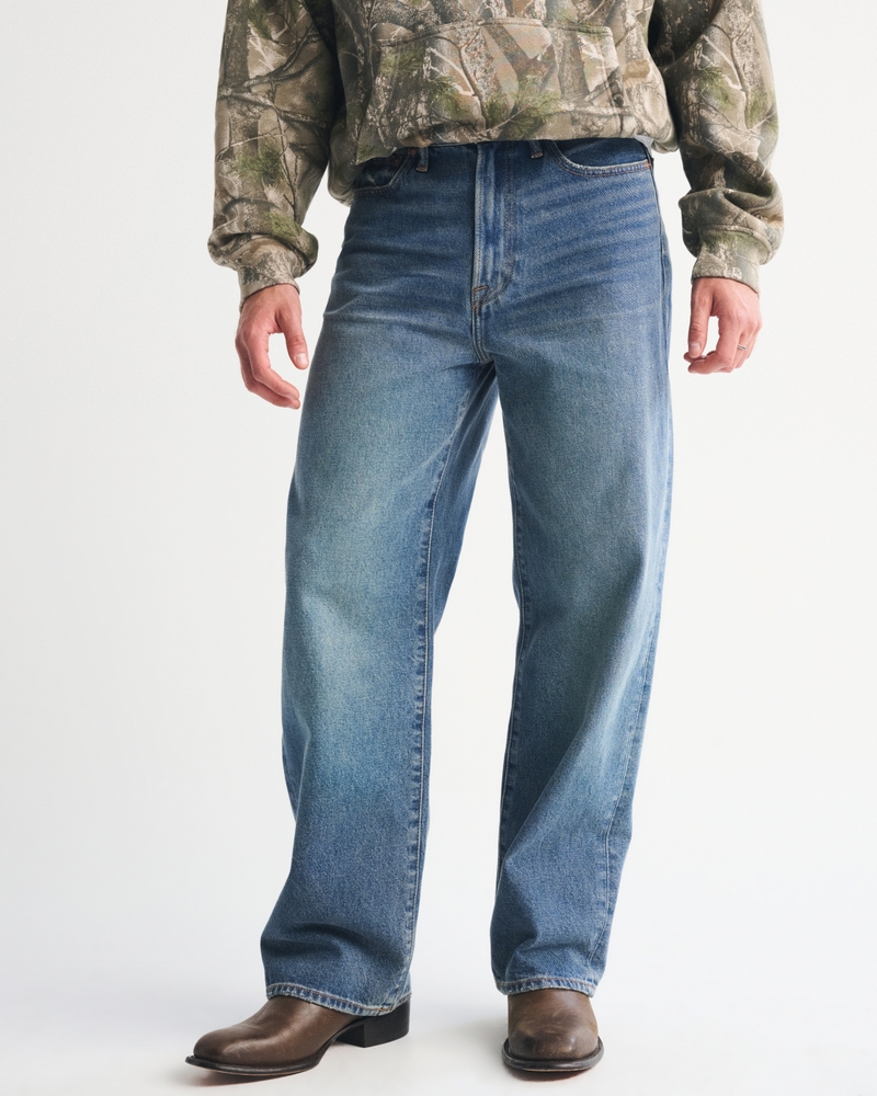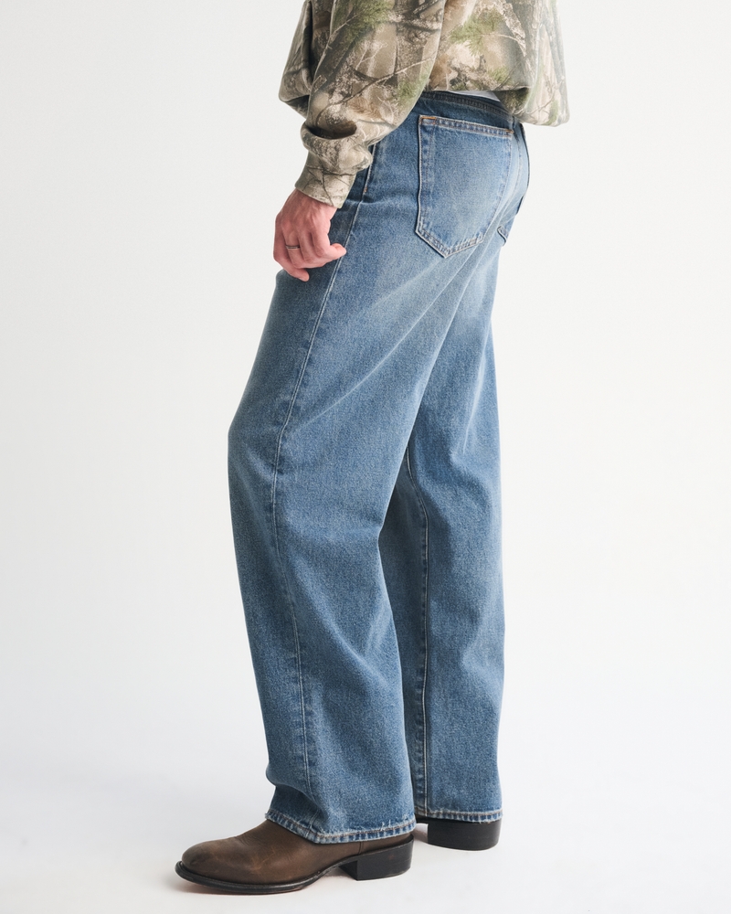 Our new baggy jeans, that are relaxed and baggy-fitting through the leg with slight puddle at the shoe, in our 100% cotton no-stretch fabric and broken-in denim feel. Features a dark wash and clean hem. Features a longer inseam designed to puddle around the shoe. For a shorter visual, choose a shorter inseam.