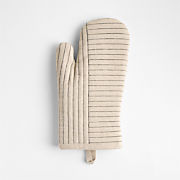 Inspired by our wood and ceramic Hanno collection, this oven mitt exhibits the same dynamic combination of horizontal and vertical stripes. Slender embroidered stripes stitched in black on natural linen-organic cotton give the glove multidirectional linear interest. Protecting hands from hot pans and bakers, the oven mitt pairs with the matching pot holder for coordinated cooking, baking and serving.55% linen and 45% organic cotton. 100% organic cotton lining. Polyester batting fill. Hanging loop. Machine wash delicate, tumble dry low. Do not bleach or iron. Made in India.