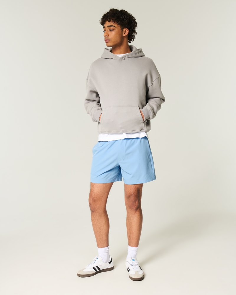 A sporty fabric makes these the most versatile shorts in your lineup for outdoor hangs, gaming and everything in between. Banded waist, right zipper pocket. Hits mid-thigh.