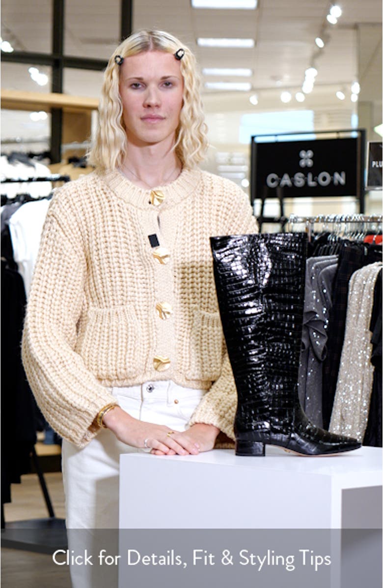 <p>A glossy finish enhances the croc embossing of this knee-high boot featuring a cap toe and low wrapped heel.</p>