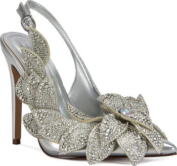 <p>Twinkling rhinestones shine like morning dewdrops on this pointed-toe pump embellished with petal-shaped accents.</p>