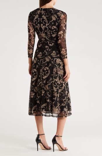 <p>A soft side tie detail gracefully frames the hourglass silhouette of a wrap-style dress featuring long mesh sleeves and a graceful midi-length skirt.</p>