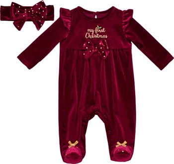 <p>Get your little one ready for their first Christmas photos in this soft velour footie that comes with a matching bow-embellished headband for sweet style.</p>