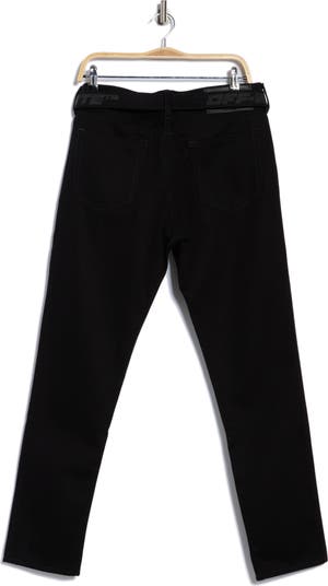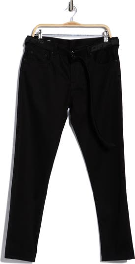 <p>A woven belt plummets to the knee on unwashed Italian jeans made of deep-black cotton, with a late-night vibe and a skinny, contour-hugging fit.</p>