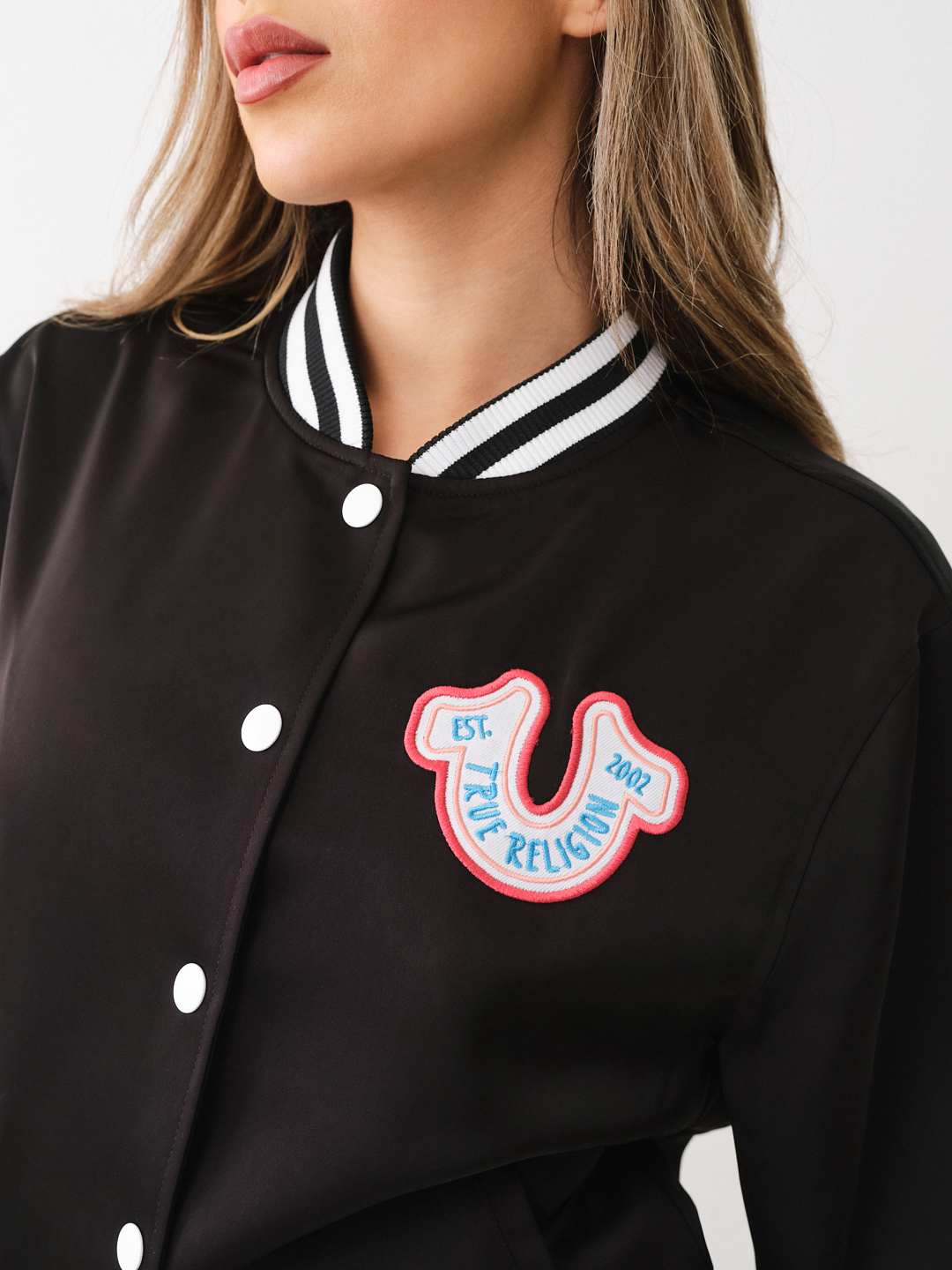 Rep true in the Horseshoe Varsity Bomber Jacket. Crafted from soft satin, this jacket features a flat collar, snap-button front, dropped long sleeves, and varsity-striped trim. Finished with a front horseshoe patch and back “TRUE RLGN 02” text. Style: 600078