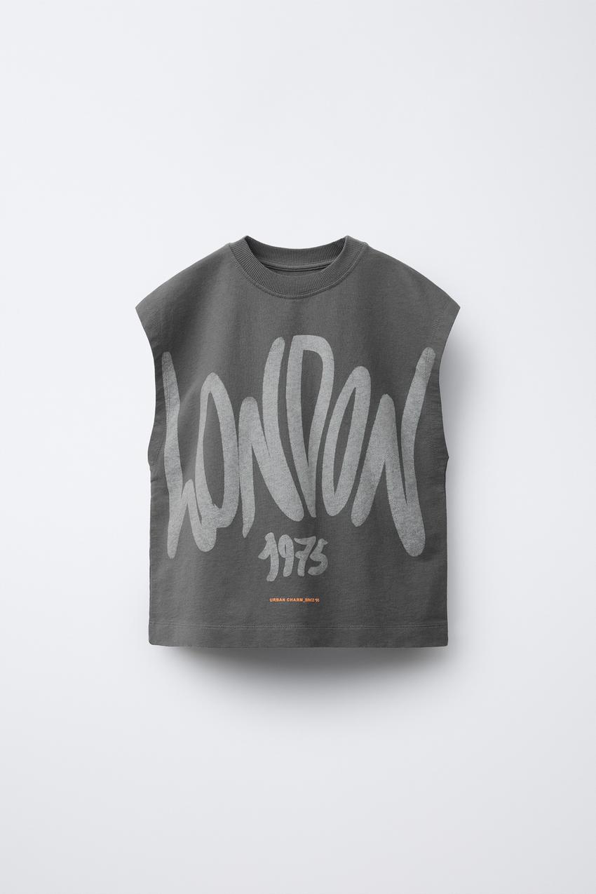 Round neck T-shirt with sleeveless design. Graffiti print on the front. 100% cotton fabric.