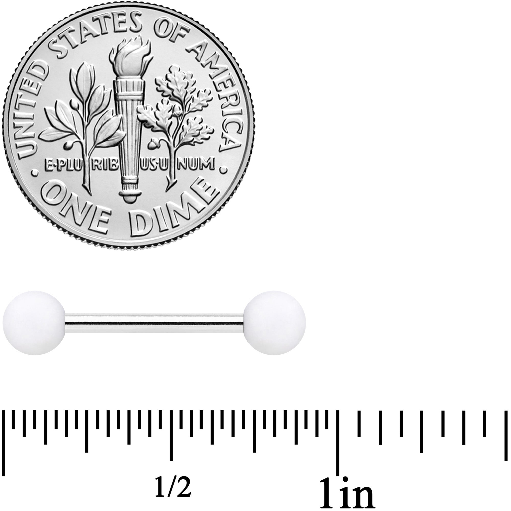 Product Details14 Gauge 9/16 White Matte Barbell Nipple Ring Set Simple style and snowy white color combine to make comfortable and dainty nipple jewelry with these 14 gauge nipple rings! They're made with 14mm durable 316L surgical grade stainless steel straight barbells. The 5mm ball ends are white in color with a subtly soft, matte finish to them. Keep it simple while still keeping it stylish with these softly, snowy white nipple rings! Sold as a set of two.Specifications14 Gauge (1.6mm), 9/16" (14mm), 316L Surgical Grade Stainless Steel Straight Barbells, 5mm Ball Ends, Sold as a Pair