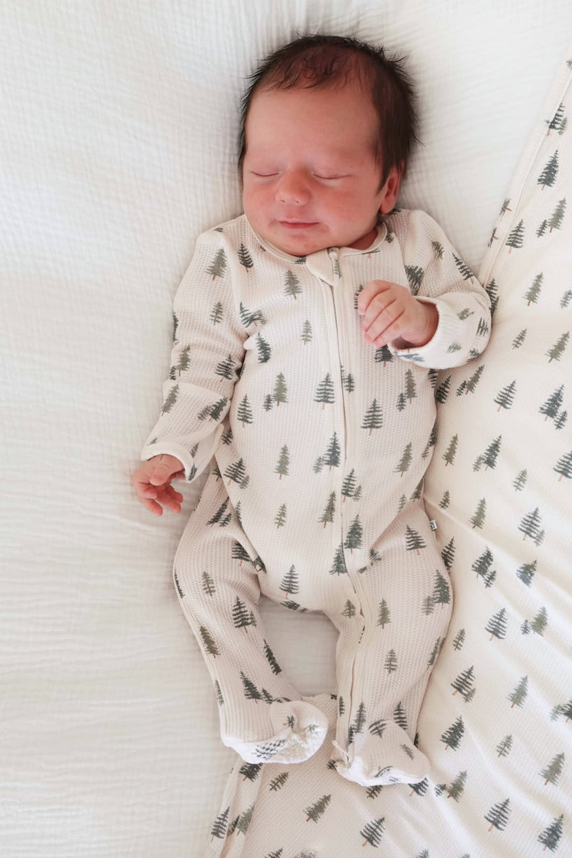 One-Piece Footie Details: 95% Bamboo Viscose | 5% Spandex Footed One-Piece with Zipper and Grips Double-zipper style for easy diaper changes True-to-size (4 sizes available) Includes: 1 Zipper Footie (Accessories sold separately) Care Instructions: Machine Wash Cold - Gentle Cycle Phosphate Free Detergent Recommended for Color Care Line Dry / Air Fluff Do NOT use Fabric Softener Bundle your little one in woodland coziness with our Evergreen Bamboo Waffle Zipper Footie! Covered in sketched pine trees on a creamy neutral background, this footie captures the magic of fall in the softest way. Made from breathable bamboo waffle fabric, it’s gentle on your baby’s skin while offering just the right amount of stretch for sleep and play. The two-way zipper makes changes quick and easy, while fold-over mitts on smaller sizes keep tiny hands warm and scratch-free. Perfect for cozy days at home, first outings, or holiday photos, this footie is an instant favorite for fall and beyond!