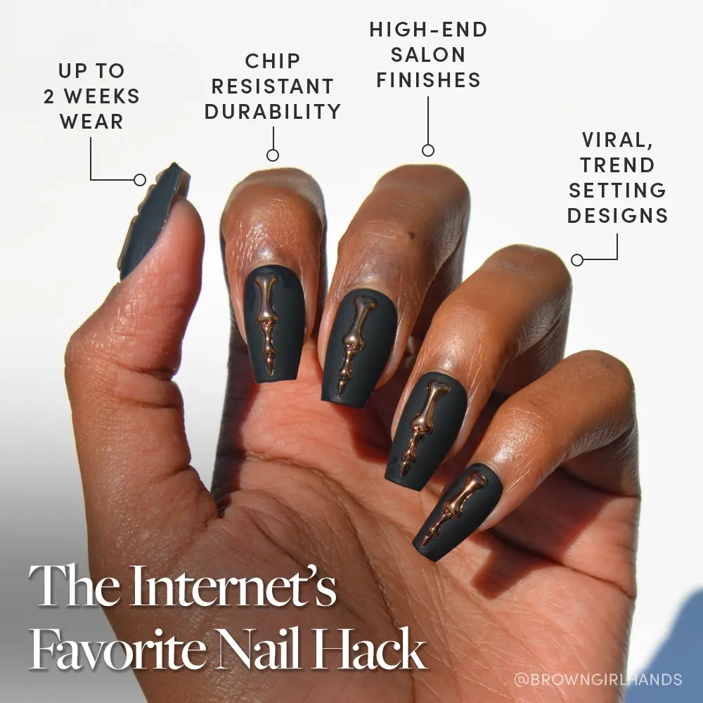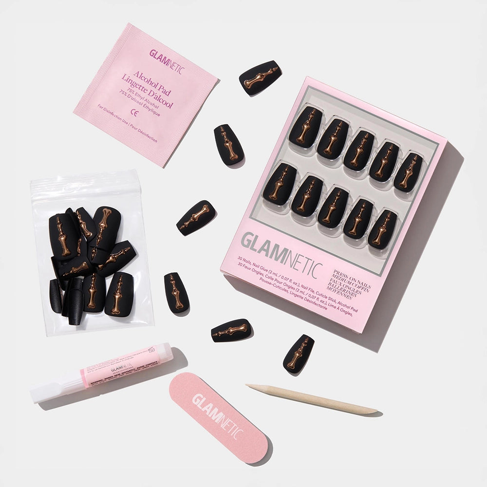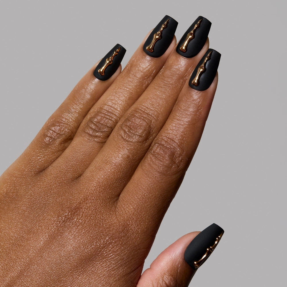 Elegance from the other side. Rosy Remains brings skeletal glamour to the show with rose gold 3D bone details laid across a matte charcoal coffin base. This is the kind of beauty that commands attention — both in the spotlight and in the shadows. Key Features: - Length: Medium - Shape: Coffin - Finish: Matte - Opacity: Opaque - Thickness: 0.6mm - Each wear lasts up to 2 weeks - Waterproof - Customizable - Vegan & Cruelty-free