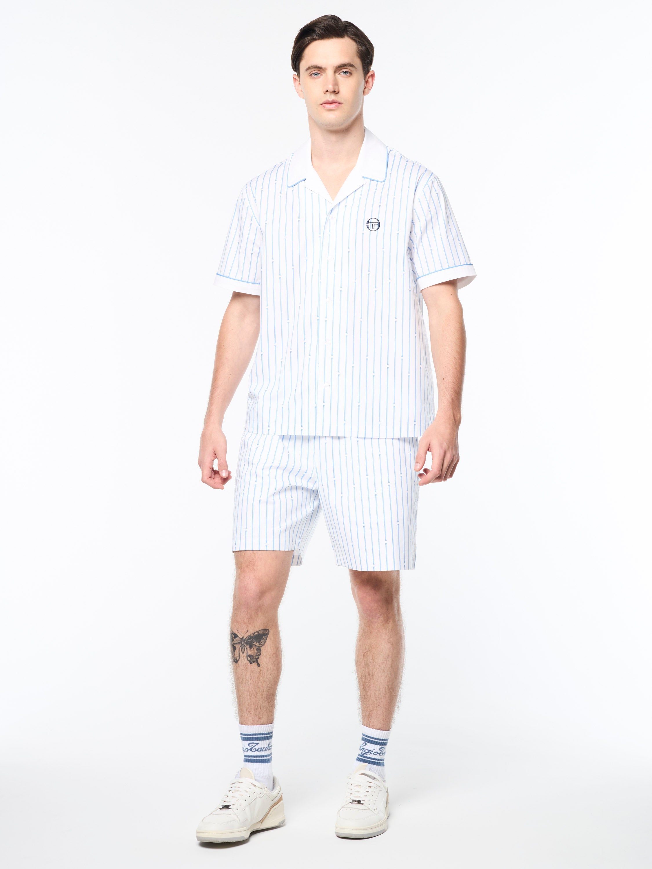Inspired by Roman columns—a nod to Sergio Tacchini's Italian heritage.The Colonna Cabana Shirt is crafted from luxurious stretch cotton poplin featuring an all-over Roman column pinstripe print for a casual look with a touch of elegance. Topped with a laidback camp collar, this resort-ready button up is lightweight and breathable with a subtle stretch making it perfect for travel and warmer weather.Pair with the Colonna Cabana Short for the full fit. (Sold separately) Premium stretch cotton poplin cabana shirt 98% cotton / 2% spandex Relaxed resort silhouette w/ camp collar Button-up front with custom buttons All-over Roman column pinstripe print Embroidered 'ST' monogram logo at left chest Piping detail at solid color camp collar and cuffs Side-seam vent slits at hem Seasonal "Colonna" capsule Style #: STS25M51113 Regular fit Model is 6'0" (183 cm) and wearing size medium (USA) / large (EU)