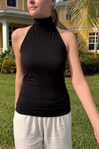 Halter neck tie backless top with a strap.Fabrics: 95% viscose, 5% elastanMeasurements: 21" (55cm) length, 14" (36cm) bustMade in: China