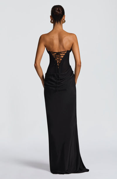 The Liora Maxi Dress in black features a non-stretch cupro skirt and bust panel, complemented by a sheer mesh waist. Its strapless scooped neckline with cowl and lace-up back create an elegant silhouette, while the asymmetric low cowl detail on the skirt adds a refined, modern touch. Colour: Black. Maxi length. Non-stretch cupro skirt & bust panel. Sheer mesh panel on waist. Scooped, strapless neckline with cowl. Lace up back. Asymmetric low cowled detail on skirt. Skirt is lined. Invisible zipper in side seam with hook & eye.
