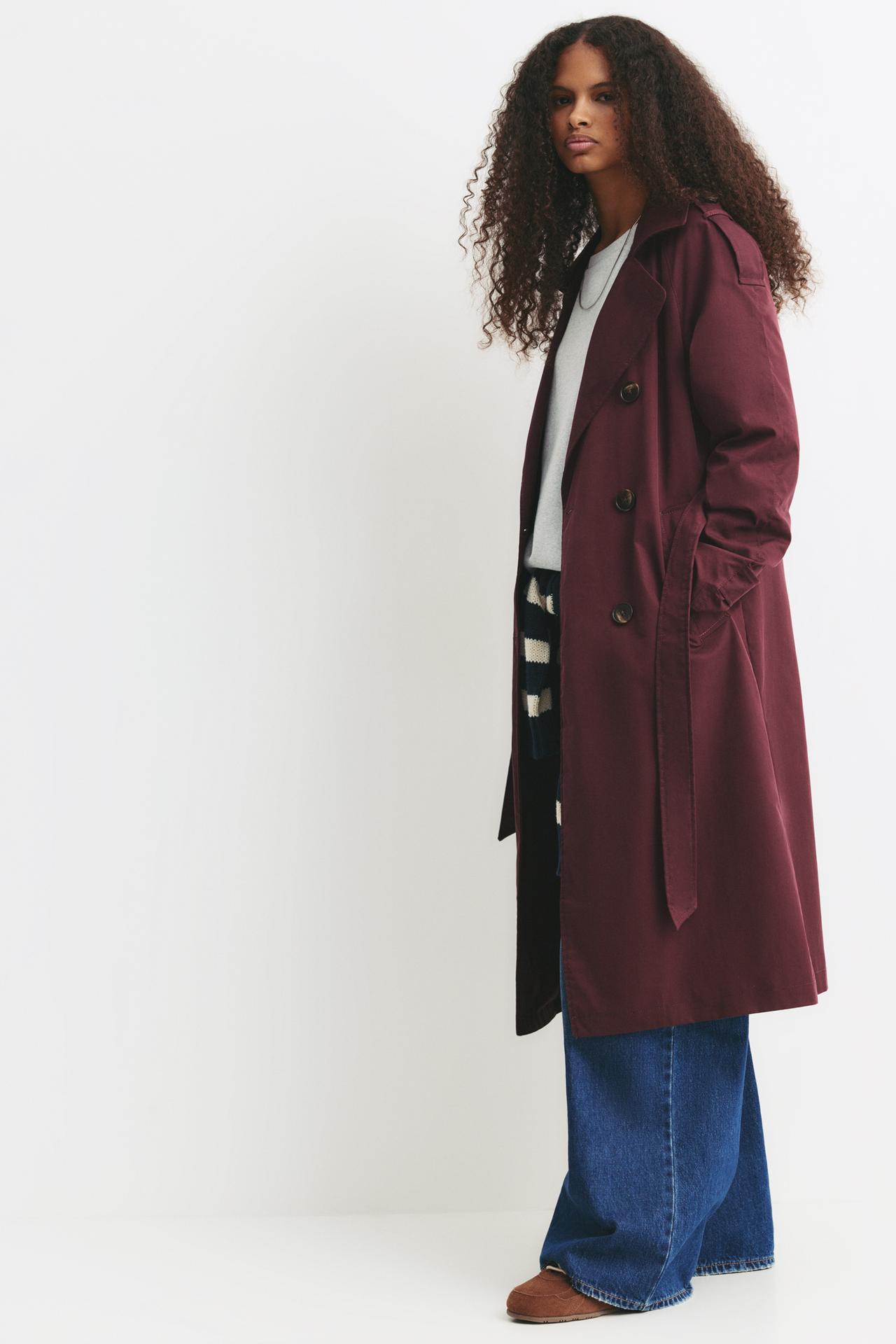 Trench coat with a lapel collar, a belt with loop fastening, side pockets and double-breasted button fastening at the front.