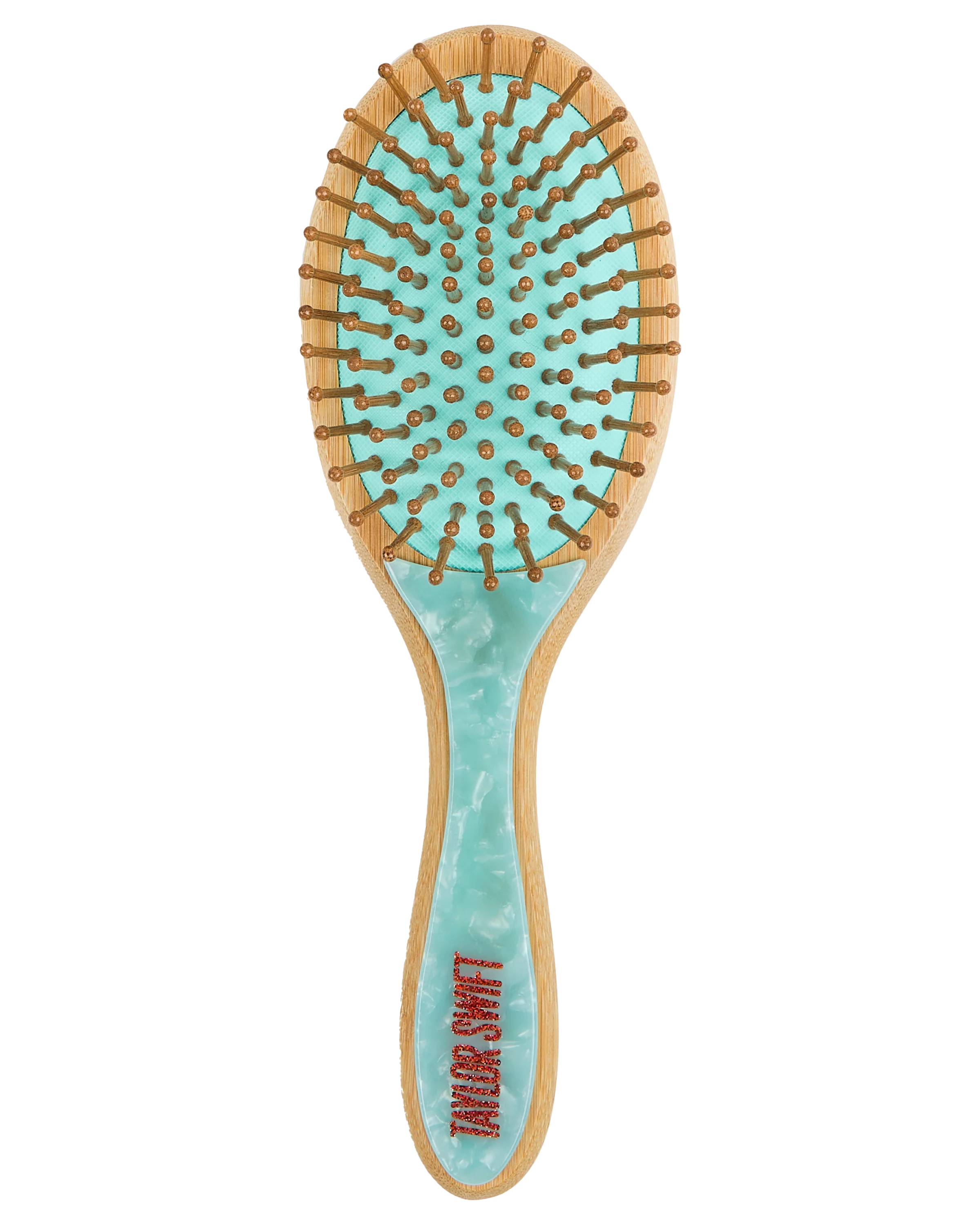Mint green pearlescent hairbrush featuring "The Life of a Showgirl" album logo in orange sparkle printed on back of brush and "Taylor Swift" logo printed on front of handle. Includes a ventilation opening.Cellulose acetate and Bamboo9"x 3"Limit 4 per order. Taylor Swift®©2025 TAS Rights Management, LLCUsed By Permissio